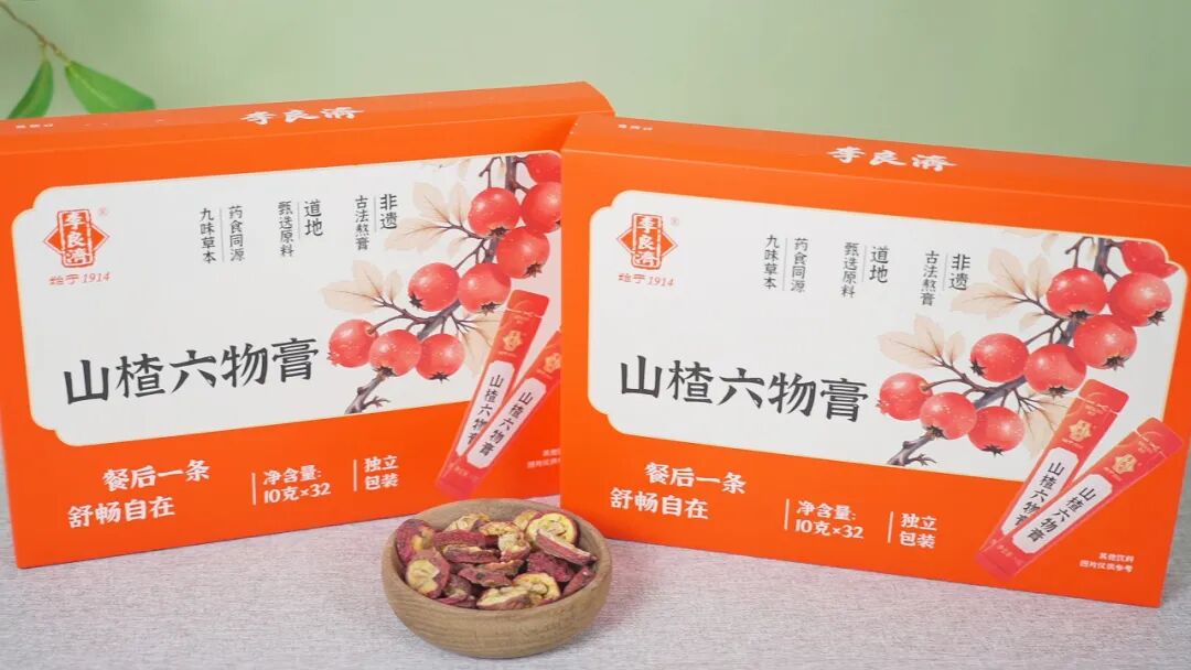山楂六物膏,采用的是李良济传承111年的非遗膏方技艺,从选材到成品历经多道工序:精选道地食材,经浸泡、煎煮、浓缩、化膏、过滤、收膏等环节,古法熬制,最终浓缩成“滴水成珠、一拉成丝”的精华膏体。