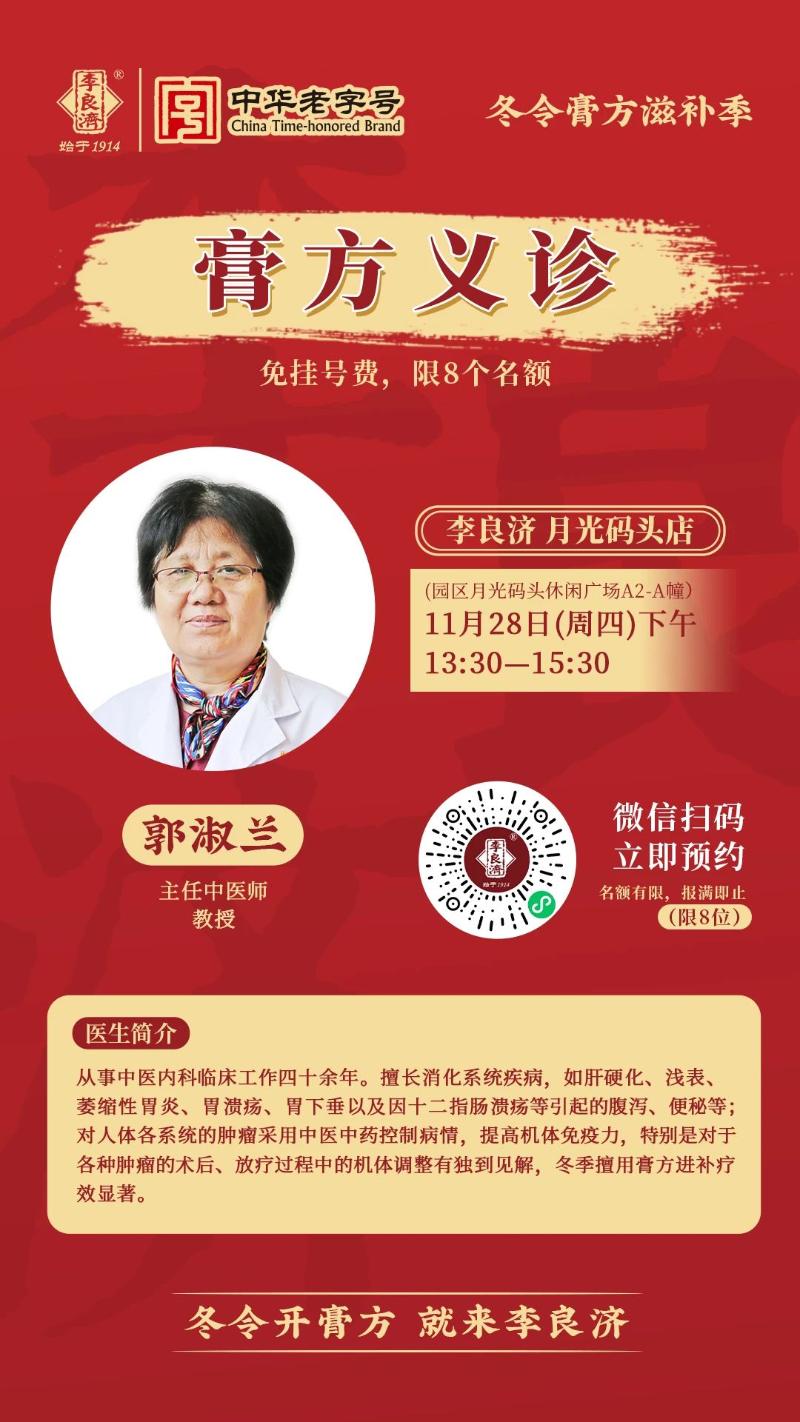 11月28日下午,郭淑兰主任在李良济月光码头店坐诊,免费送出8个义诊号,义诊免挂号费!