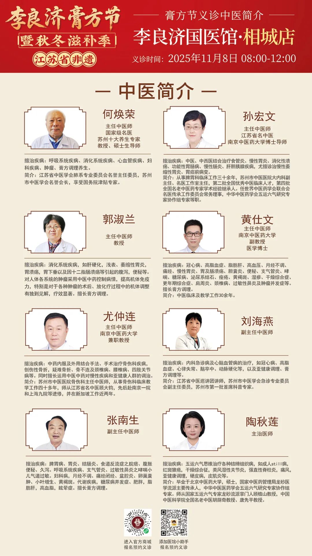 本周六上午,李良济膏方节相城店专场将再次开启,特别邀请多位名医专家义诊,为您望闻问切,仔细辨别体质,可根据您的健康状况为您开具秋冬调养膏方,助你健康调养!