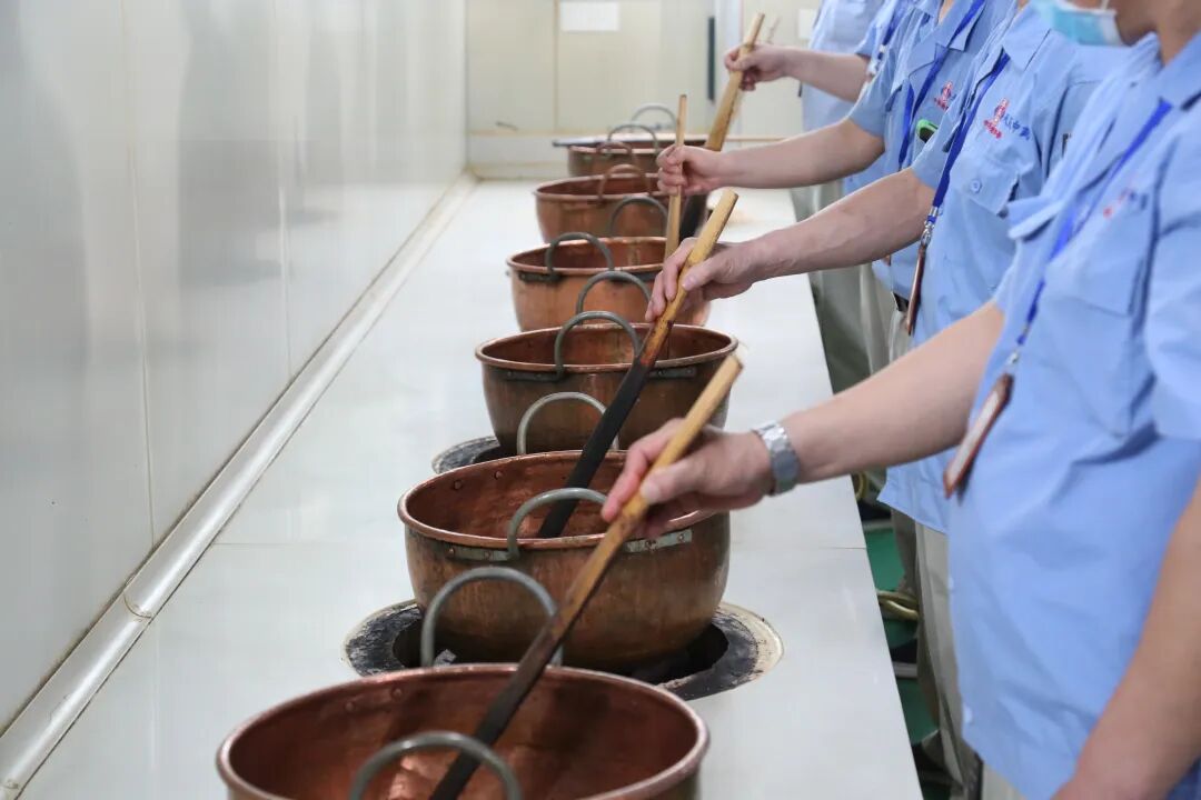 熬膏最关键的收膏这一步,需按照处方要求兑入细料、药胶等,以小火慢熬、不断搅拌,待药胶、糖等烊化至药液起“鱼泡眼”,能拉扯成旗,习称“挂旗”,此时收膏效果为佳。这一系列环节只要有一个环节出了问题,都会影响膏方的质量。