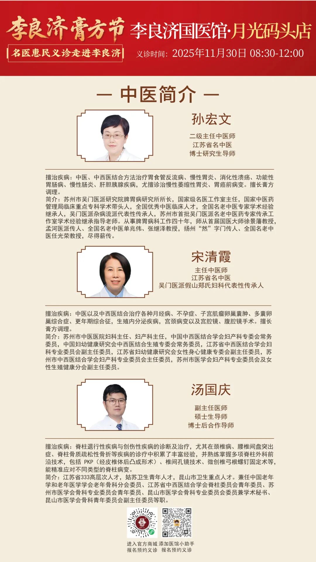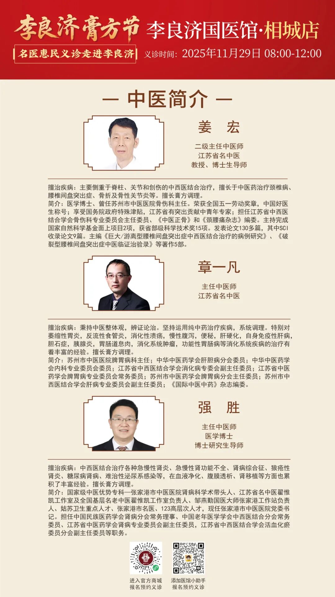 11月底,名医惠民义诊将走进李良济,为市民朋友们义诊开膏方,时间地点分别是:11月29日相城店,11月30日月光码头店,现在预约渠道已开启,您可以点击下方线上挂号预约!