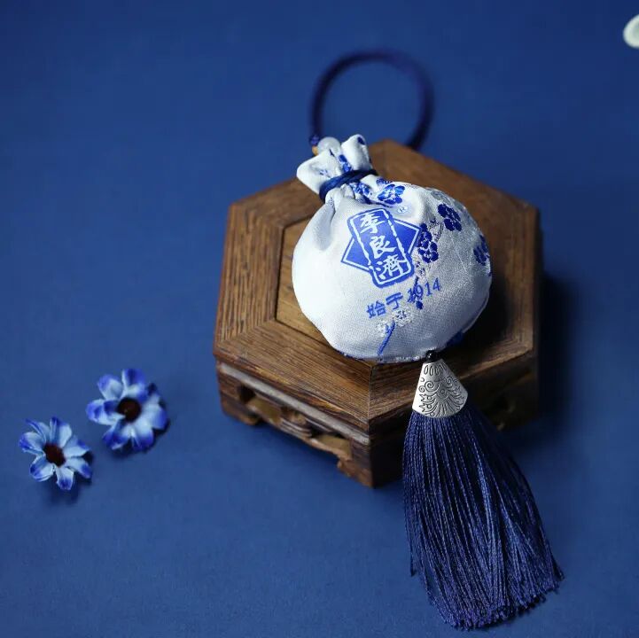 这款蓝色的端午香囊,优选道地中药材苍术、山奈、藿香、佩兰、菖蒲、白芷、肉桂、冰片,分别装入无纺纱布和透气性良好、做工精致的布袋中,散发着自然药香。