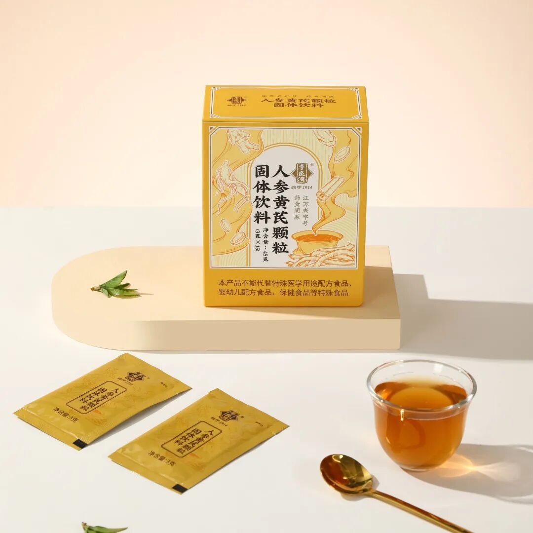 人参黄芪颗粒固体饮料的黄芪,使用的黄芪浓缩液为老药工精心煎煮浓缩,该原料为国家开展药食同源试点时,授权李良济用于普通食品使用的原料之一,黄芪目前已经被正式列为药食同源原料。