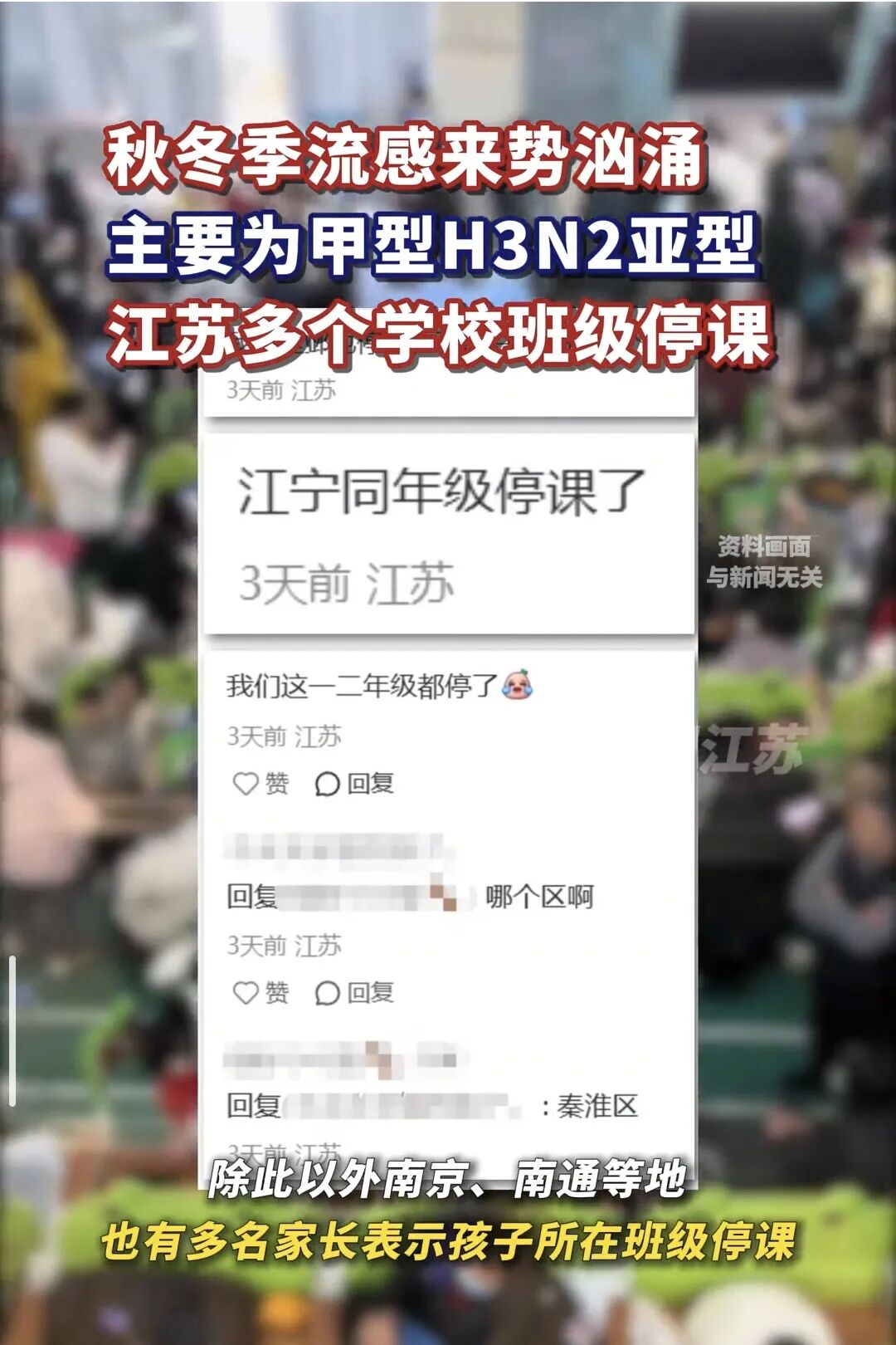 冬季气温偏低,是流感高发期,最近有家长朋友反馈,班级一大半同学都请假了。近日有不少江苏家长,在社交平台上表示这波流感来势太猛,多个学校班级停课。