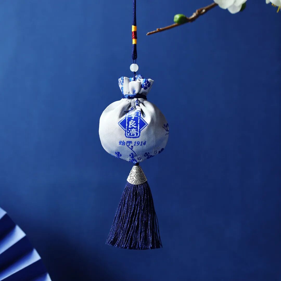 这款蓝色的端午香囊,优选道地中药材苍术、山奈、藿香、佩兰、菖蒲、白芷、肉桂、冰片,分别装入无纺纱布和透气性良好、做工精致的布袋中,散发着自然药香。