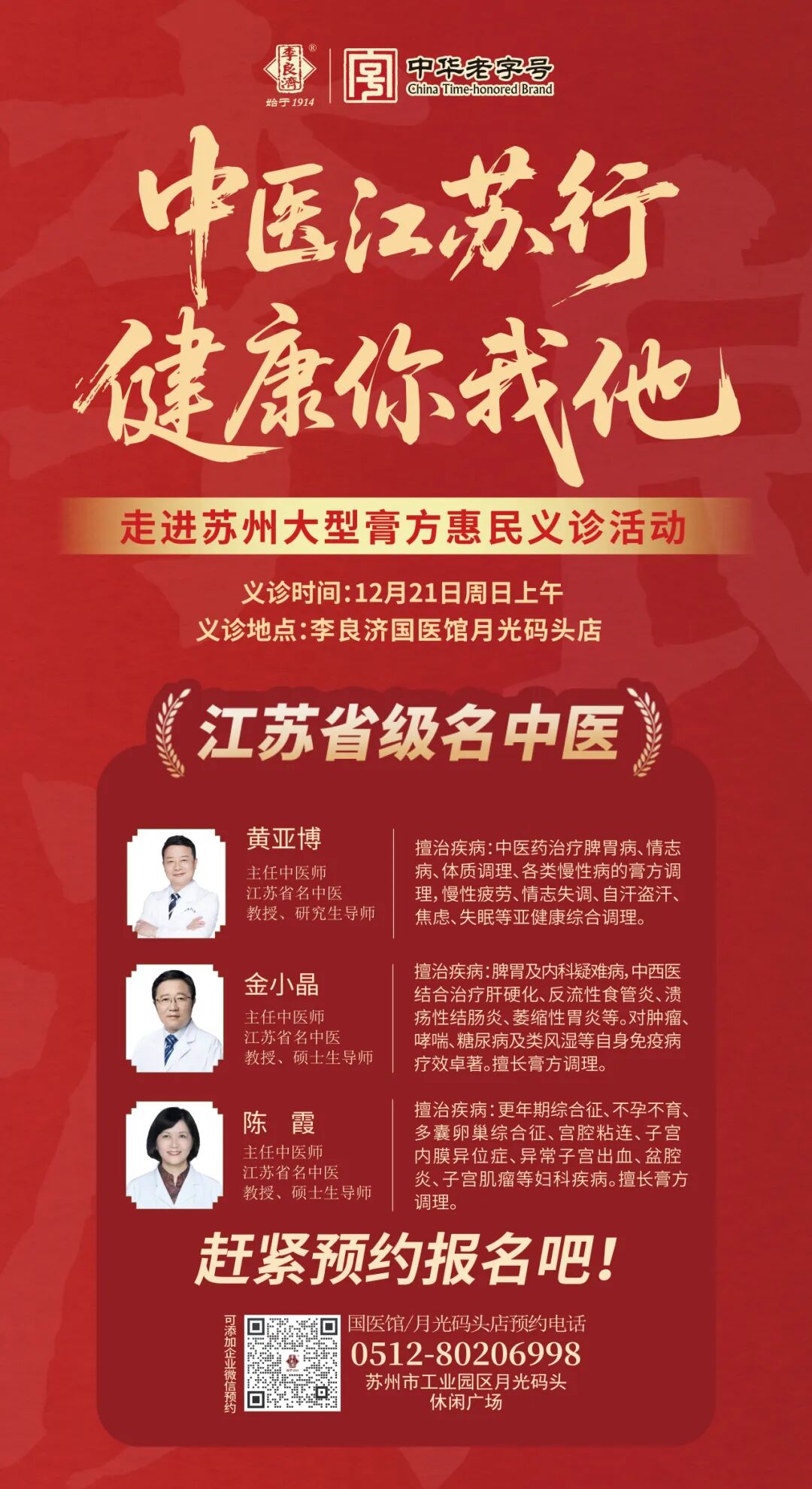 12月21日,“中医江苏行”惠民义诊活动走进李良济月光码头店!省级名中医组团义诊,家门口的优质诊疗服务,错过真要等一年!