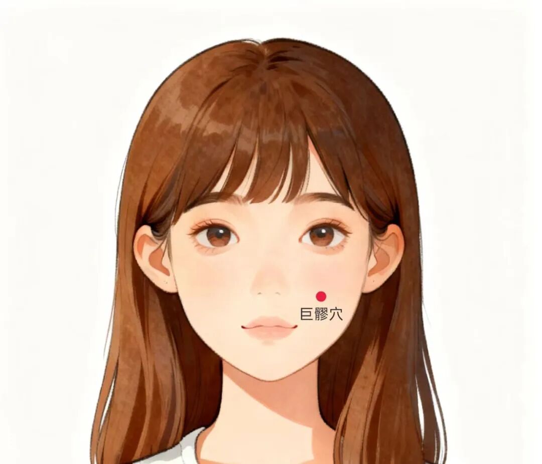 巨髎穴在面部,横平鼻翼下缘,瞳孔直下。(鼻翼下沿和瞳孔正下方的交界点)简单来说,此穴正位于苹果肌下缘、法令纹上缘。