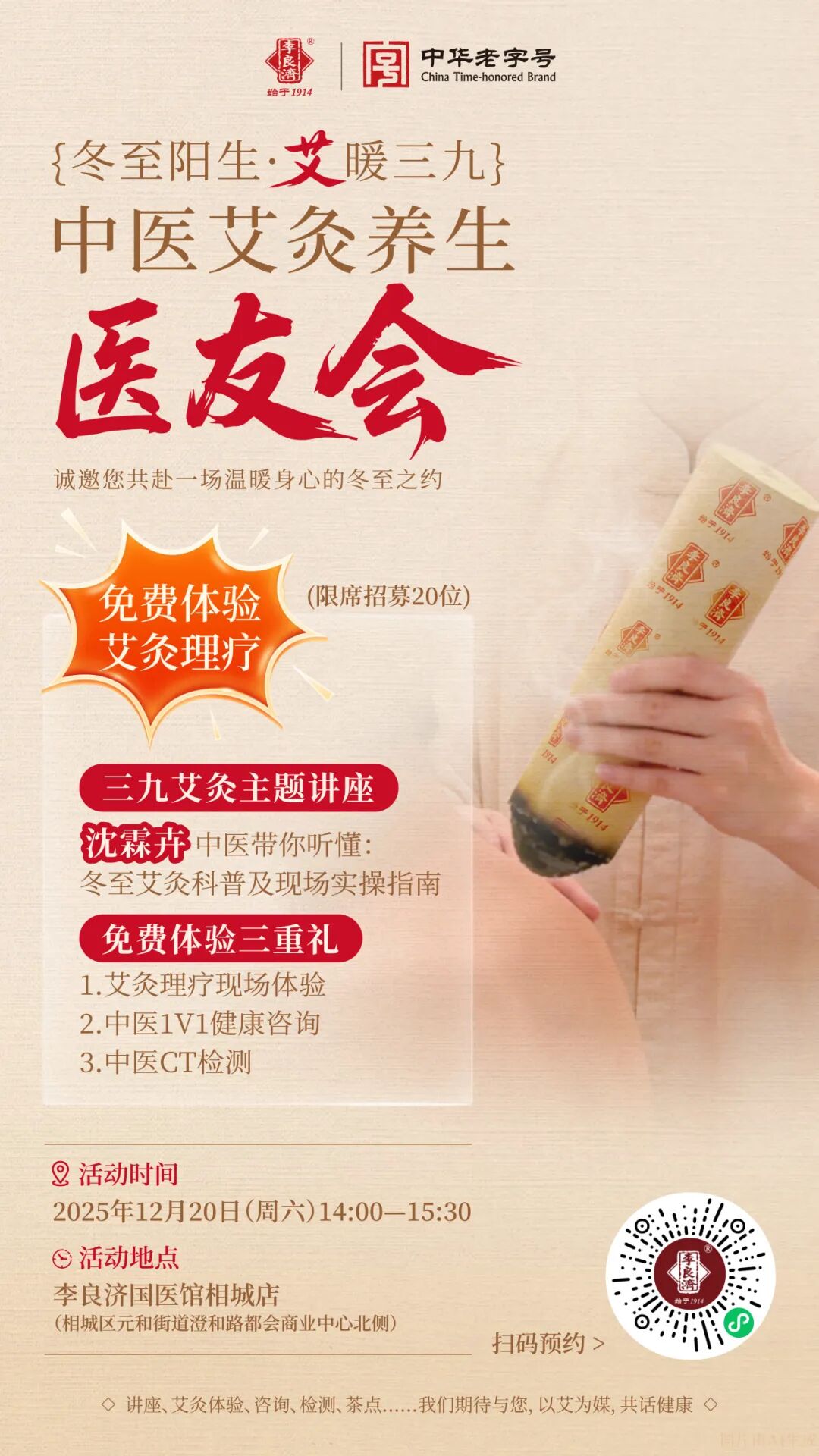 三九将至,艾灸养生正当时!本周六下午,中医艾灸养生医友会,将在李良济相城店开启,现场特邀沈霖卉医生,为大家带来“三九艾灸”主题讲座!本次活动免费哦~