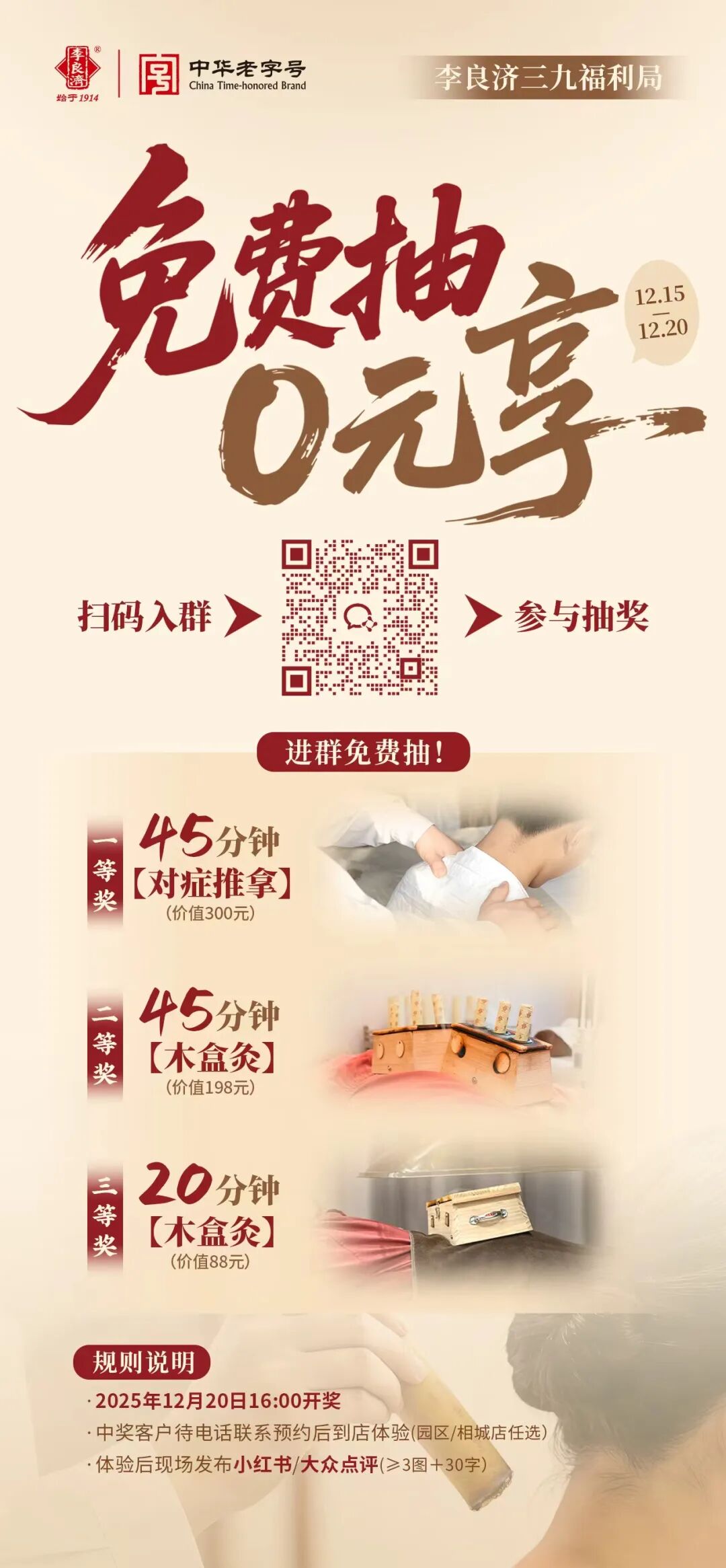 为了让大家感受对症推拿的舒缓力量、木盒灸的温阳驱寒魅力,李良济特推出“三九福利局”,推拿、木盒灸免费抽、0元享活动!