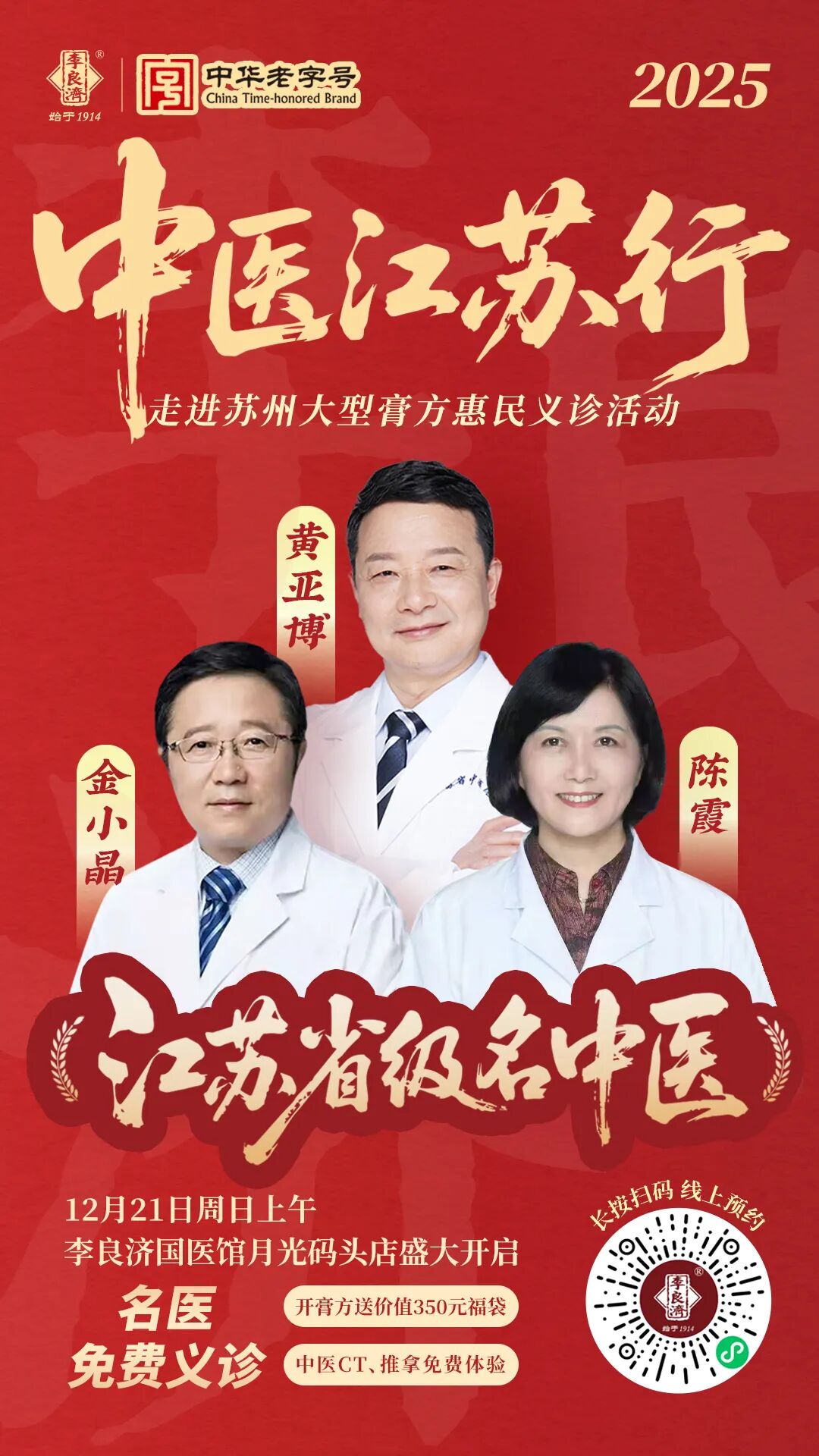 为了方便市民朋友在冬至后用膏方来调补,12月21日(本周日上午),“中医江苏行”省级名医义诊团将走进李良济月光码头店,为市民朋友们免费把脉问诊!