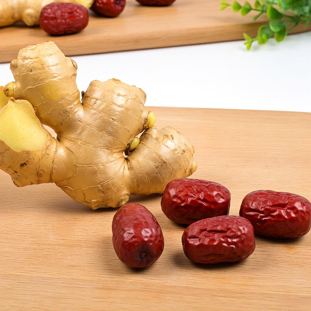 材料:生姜 5 片(带皮切)、大枣 6 颗(掰开去核)。