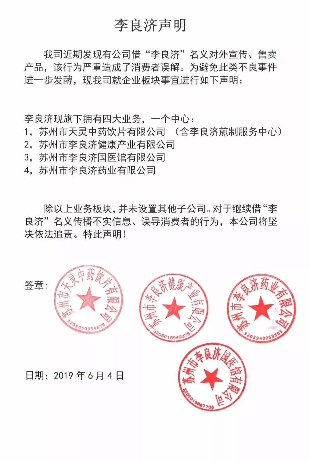 关于某公司盗用“李良济”名义的声明